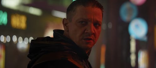 Jeremy Renner's Hawkeye was missing from Avengers: Infinity War. But as the trailer for Avengers: Endgame shows, he's back, and he doesn't look quite like the Clint Barton Marvel Cinematic Universe fans are used to seeing. It sure seems like Hawkeye in Avengers 4 may now be one of his comic counterparts — Ronin. In the first Avengers 4 trailer released on Dec. 7, Scarlett Johansson's Black Widow finds Hawkeye on what appears to be a street in Japan rocking a new hooded suit and a weapon that is not his familiar bow and arrow. Natasha definitely seems surprised to see her old fighting buddy looking so different. But while Black Widow is in shock, Marvel fans already have some pretty solid theories about what Hawkeye is up to in Avengers: Endgame.