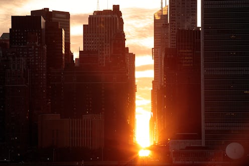 Many of the most iconic city-scape photos in the world come from the glittering Manhattan skyline, and thanks to a rare solar occurrence that's happening this week, New Yorkers can add a professional-grade shot of their own to the mix (or Instagram). Manhattanhenge is a an odd but beautiful phenomenon that happens only four times a year — on the days before and after the summer solstice. When it does happen, the buildings of Manhattan and the bright, glowing evening sun line up in perfect symmetry. During Manhattanhenge, the sun hovers like a fiery, neon orb over the city, casting its dreamy, dusky sunlight over the glass of the city’s buildings. It’s like something out of a tropical greeting card or Hollywood blockbuster. And while it requires being in just the right place at the right time, if you’re in New York, it’s well worth going out of your way to catch the light show. Here’s when to see Manhattanhenge 2017.