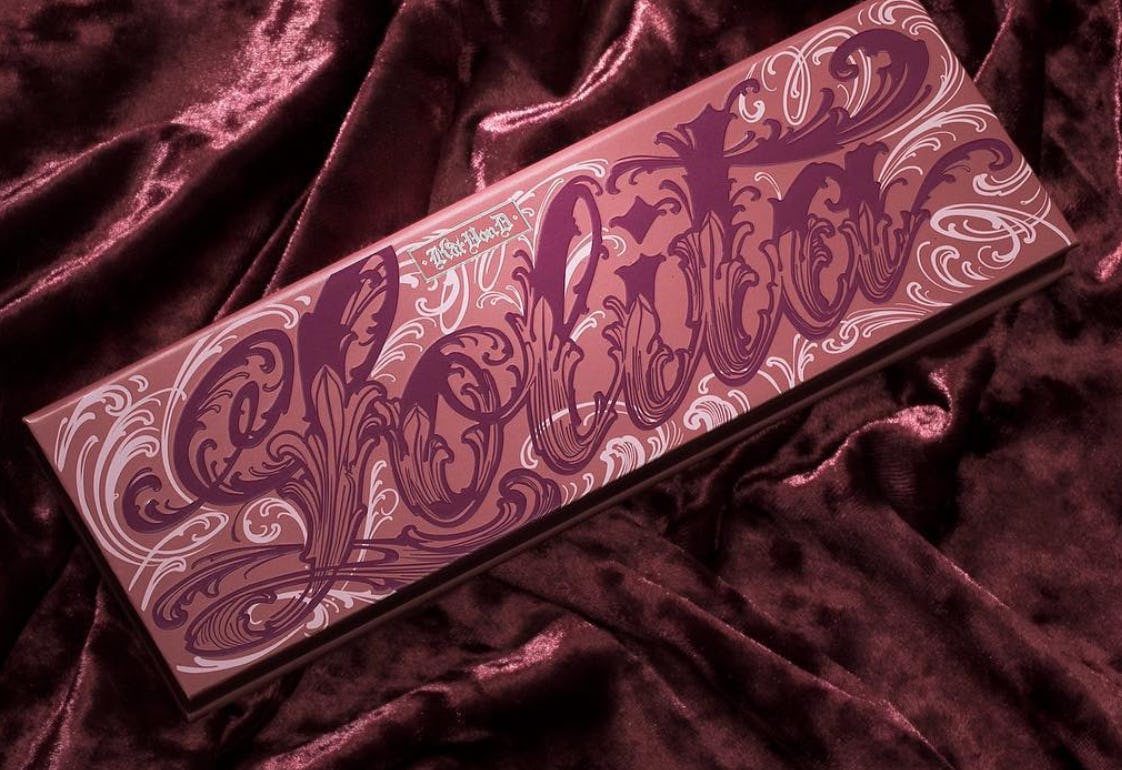 Here's the overview. The small palette design features the signature KVDB gothy graphics. The range also includes a Lolita Everlasting Glimmer Veil, which is a topcoat aka a lip gloss, and a rose-toned Inkwell Liquid eyeliner.