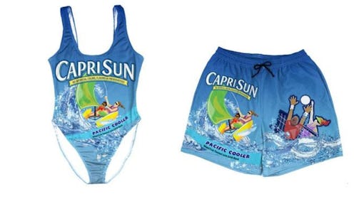 If the retailer name sounds familiar, that’s because it’s the same brand responsible for those LaCroix one-piece swimsuits. The same brand is now offering up Capri Sun-inspired beach wear that includes another one-piece swimsuit and also swim shorts printed with the Pacific Cooler flavor’s packaging.