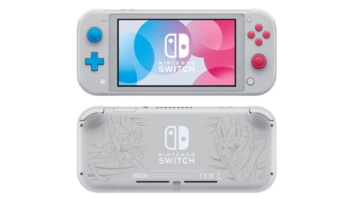 The Zacian and Zamanzenta edition doesn't include anything that the regular Switch Lite doesn't have — the decals and colours of the console are themed to fit the games. Instead of the yellow, turquoise, and grey colours and pale grey buttons, this edition is light grey and has magenta and cyan coloured buttons to match with the two mascot characters. There are also decals of Zacian and Zamazenta on the back of the Switch Lite, much like the Pokémon Let's Go Pikachu & Eevee edition of the Nintendo Switch released last November.