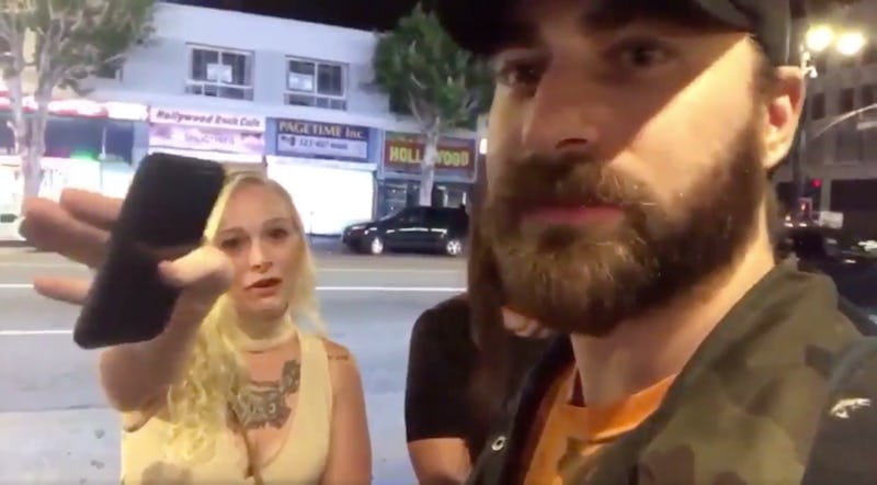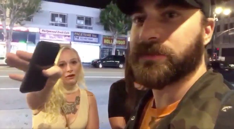 When one of the women tells him repeatedly that she doesn't want to be on camera and pushes his phone away, Gionet says, "You can't touch my property or me," stating that he's on a public street, and so he can film whatever he wants. She then swats the phone out of his hand when he refuses to stop filming her, and he complains that she broke his phone. "Not my problem," she replies, eventually entering the club with her friends.