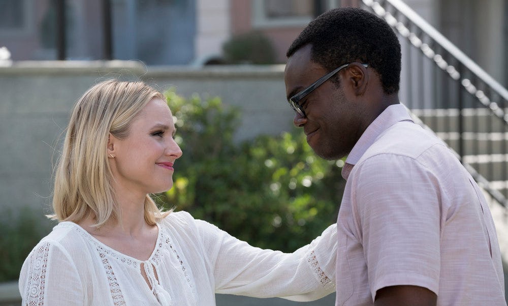 As with pretty much every TV show, there are some obstacles on the way to domestic bliss. But Schur's series show people happily dating, and eventually marrying, in a different way than sitcoms like Friends or How I Met Your Mother. It's one of the traits that makes his TV shows so forkin' endearing. And so with Eleanor softening, there's a very good chance that Chidi will come around too.