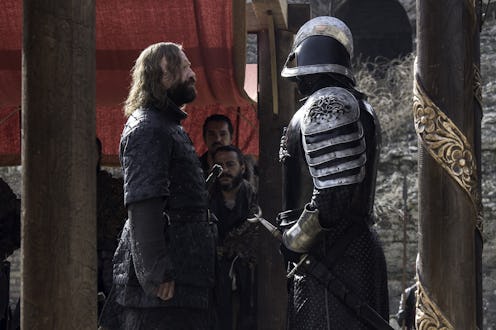Of course, most Thrones viewers will be familiar with the idea of the Cleganebowl, the long-anticipated clash between the two Clegane brothers: Joffrey's former bodyguard Sandor (aka the Hound) and Cersei's current bodyguard Gregor (aka the Mountain). The long-simmering animosity between the brothers has been a known quantity since the beginning of the series, ever since Littlefinger told Sansa back in Season 1 the horrific story of how Sandor got his scars. When a young Gregor found little Sandor playing with his toy, he picked his younger brother up and shoved his face into the fire. Ever since that traumatic moment, Sandor has been driven primarily by hatred for his older brother.