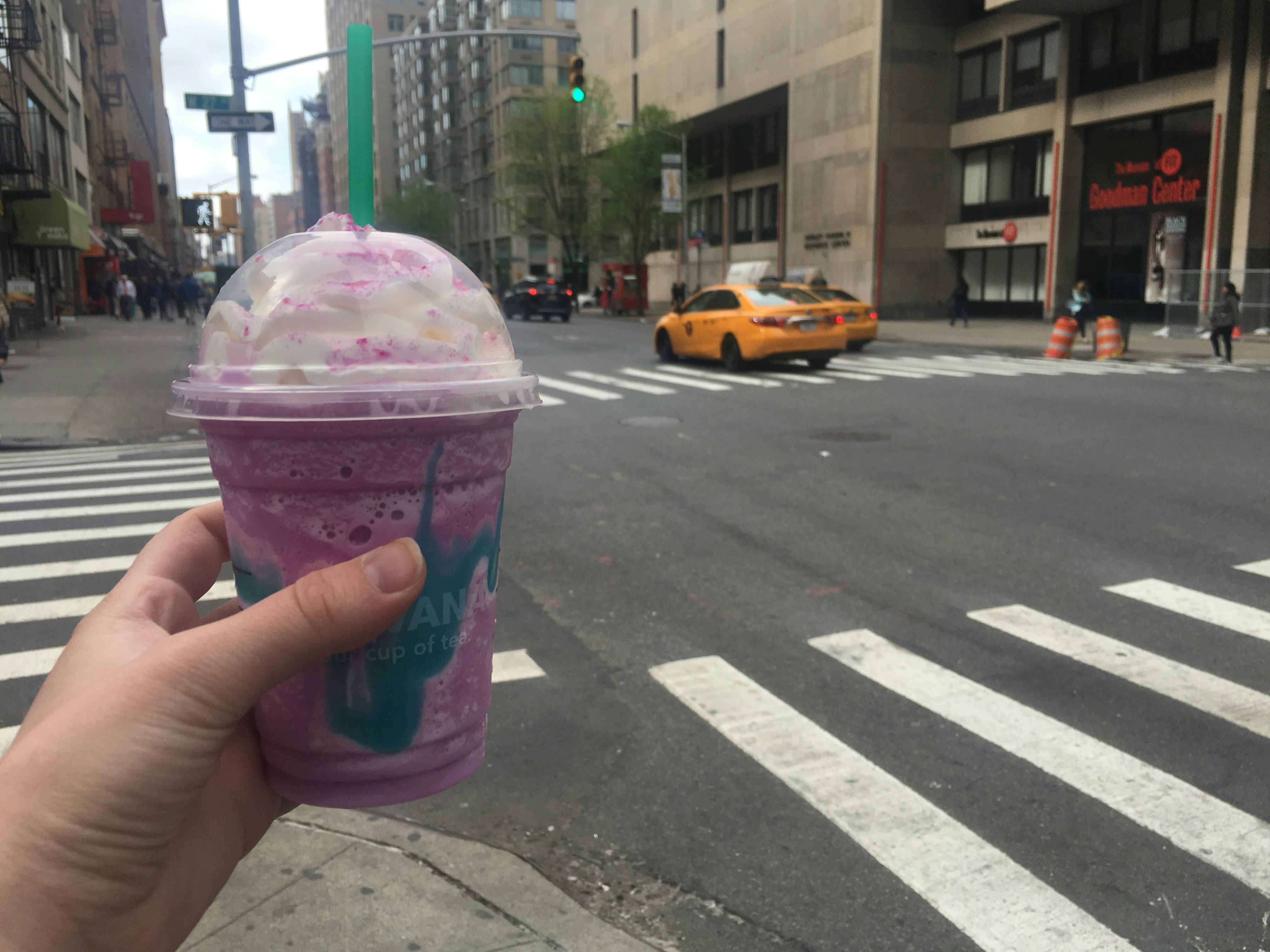 In the meantime, be sure to get ye to a Starbucks to try this drink before April 23 — it is well worth the hype. With a base of crème frappuccino mixed with mango syrup and swirled with sour blue drizzle, then topped with whipped creme and pink and blue "unicorn dust," this drink is not only magical because it delicious, but because it does what no other Starbucks drink has done before — it changes colors and flavors. The purple gives way to pink, and the sweetness gives way to tartness, and your dreams give way to reality.