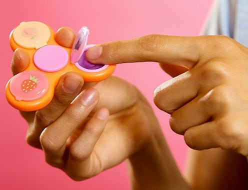 In case you're not familiar with the trend that's been taking over lately, let me fill you in. The device is simple — three ball bearings that, well, spin so you don't fidget. Hence the name fidget spinner. Recently, it got a glam little upgrade. As Bustle previously reported, Glamspin created a fidget spinner with lip gloss inside. Think: three different fruity flavors that you can alternate with the flip of a finger.