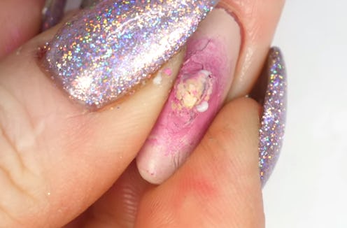 Lee takes banana hand cream and places it in the center of her nail, positioning her pus-filled pimple. She then blobs on the structure gel on top to seal in the zit, creating the "skin." If you watch the video, Lee explains how to get the coloring just right and how to contain the cream from getting all over the place. It's actually truly fascinating to watch it come to life, if a little bit eerie.