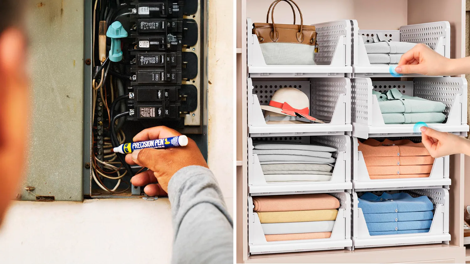 Fix: Stackable Bins That Slide In & Out Of PlaceIs your closet one of those cartoonishly overcrowded spaces that pose a hazard when you open it? These stackable bins can help create order out of all of the stuff that doesn’t go on a hanger. Made from sturdy plastic, they snap together in seconds and fold back flat when you don’t need them. A slide rail system lets you pull each one out when they’re stacked, and an open front makes items easy to access.