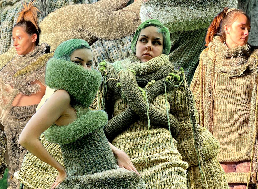 Drawing inspiration from moss and mycelium, Schulte’s inaugural collection featured zero-waste designs that meld nature with nurture and encourage positive sensory stimulation. Schulte includes elements in their clothing that they (and many other autistic and neurodivergent people like them) find soothing, like the plush touch of eyelash yarns, and compressive sensations that mimic the relieving effect of a weighted blanket. “Being autistic… informs the way I design a little bit differently, because I design through sensory experiences and textiles,” they say.