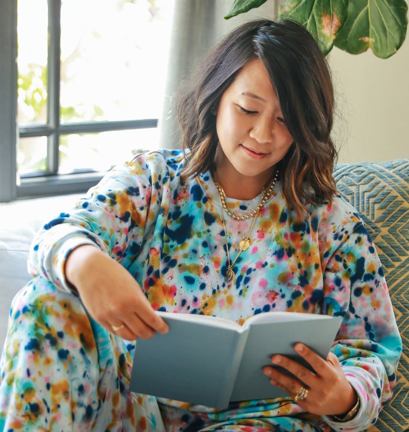 For this endeavor, she found inspiration from somewhere out of her comfort zone. “Lately, I've been more interested in fiber arts — weaving, knotting, and dyeing,” she tells Bustle about the focus that led to her latest loungewear project. “I've had this idea of using bubbles to dye fabric for a long time. The name 'Poppables' immediately triggered this vision of colorful bubbles popping into splotches of wearable color!”